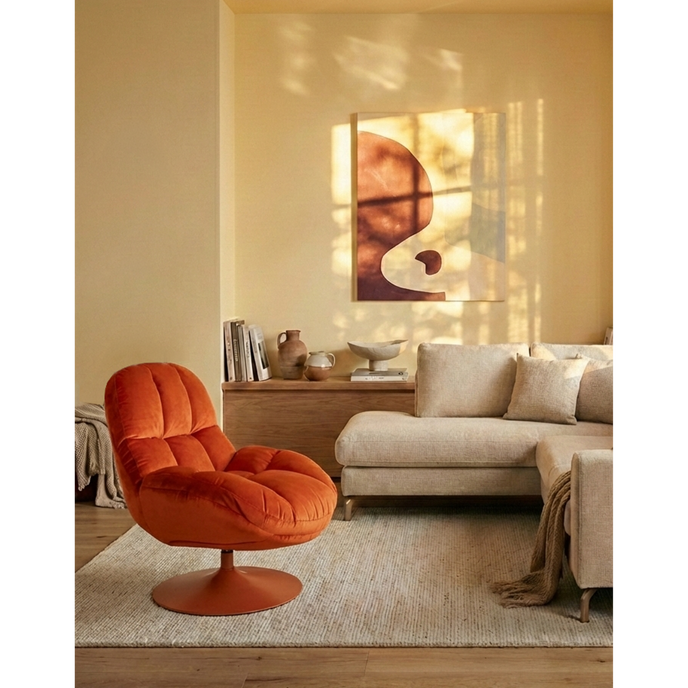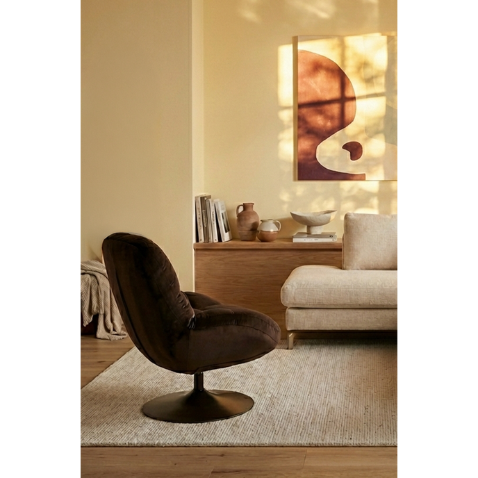 Dat de Beefy comfortabel is, zie je in één oogopslag. Deze fauteuil heeft een gecapituleerde zitting, die rijkelijk gevuld is met een dikke laag schuim. Hierdoor zak je heerlijk in de stoel weg. De stoel is bekleed met zachte stof in een diepe kleur. Deze loopt door in de metalen poot, die is afgewerkt met een poedercoating in dezelfde tint. Daarnaast is de stoel draaibaar en daardoor in iedere gewenste positie te zetten.