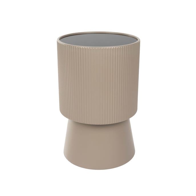 Deze bijzettafel vormt een interessante mix van zowel vormen, structuren als materialen. De ronde voet met glad oppervlak, gaat over in een cilindervorm met stijlvol ribbelpatroon. Het tafelblad is gemaakt van donker rookglas en valt perfect in de ijzeren basis. Bovendien vormt de glossy look van het glas een mooi contrast met de matte poedercoating van het ijzer. Daarnaast maken de rustige kleurtinten het meubel makkelijk te combineren.