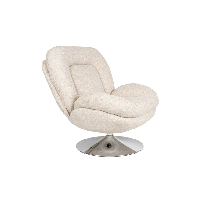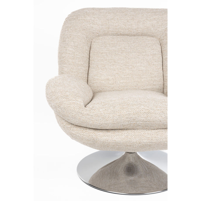 Dat de Romy fauteuil comfortabel zit, zie je al van ver. Je zakt heerlijk weg in het grote zitkussen met opstaande randen. Ook de rugleuning met opvallende naad, is rijkelijk gevoerd en voelt daardoor zowel stevig als zacht aan in je rug. De grof geweven stof geeft daarnaast een fijne uitstraling en vormt een mooi contrast met de chroom-look van de poot. Doordat de stoel draaibaar is, plaats je ‘m bovendien in iedere gewenste positie.